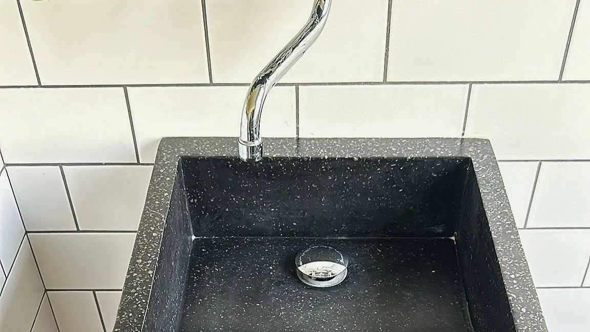 Terrazzo sink and vintage cabinetry add old-world charm while discreetly storing essentials like hairdryers and extra towels.
