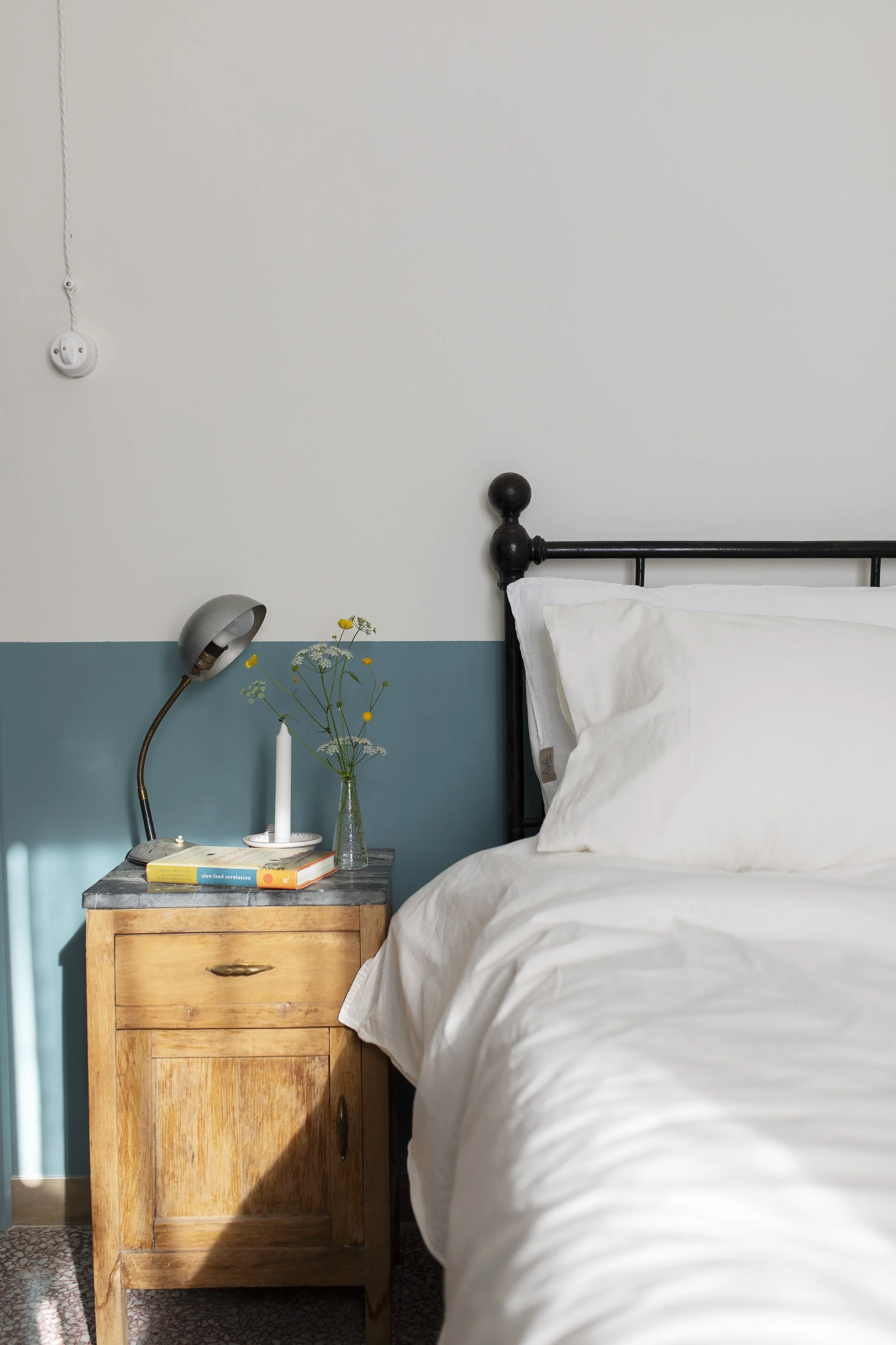 Soft blue shades create a sense of calm and relaxation. Locally sourced bedside tables with curated reading and lamps.